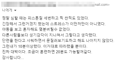 정말 심할 때는 피스톤질 세번하고 찍 싼적도 있었다.