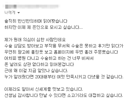 수술 상담도 받아보고 부작용 무서워 수술은 못하고 후기만 읽다가